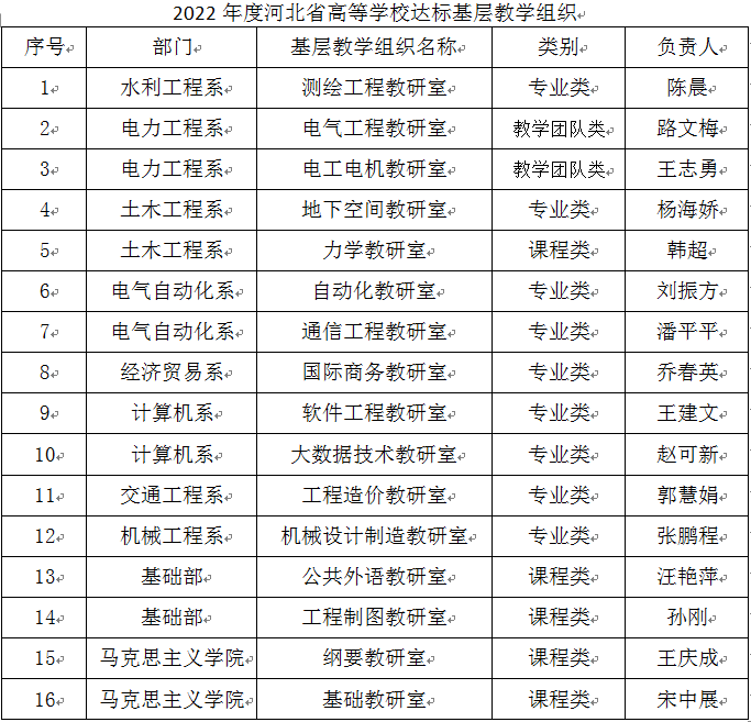 近日,河北省教育厅下发了《关于公布2022年度河北省高等学校优秀和达标基层教学组织名单的通知》(冀教高函〔2023〕13号),我院水利水电工程教研室、道路桥梁工程教研室被认定为河北省高等学校优秀基层教学组织,测...