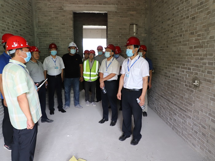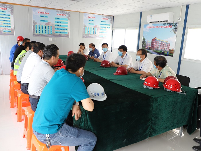 最后,学校领导与施工项目部人员进行了座谈。座谈会上,河北省第二建筑工程有限公司生产经理周福强对学校领导此次的关心慰问表示了感谢,并表示将学校关怀传达给每位工人,鼓舞工人干劲,保质保量按期完成以后的施工任务。项目经理王朝松针对工程建设进展情况和质量、工期情况作了汇报,学校后勤管理处刘国民处长针对工程部署情况向校领导作了汇报。陈进杰书记和向辉校长听取以上汇报内容后,对施工项目部克服新冠肺炎疫情带来的各种困难保障了工程进度表示满意和感谢,也对下一步的施工提出了几点要求,一是目前疫情状况仍不容乐观,接下来的内装修工程阶段,施工企业在紧抓质量工期的同时,做好对工人各方面的保障和关怀,学校将与施工企业协力合作,保证工程进度不受影响。二是施工企业要按学校投入使用的时间要求,实现合法合规入住的各项前提条件,确保新学期学生如期入住。针对以后各项施工工作,多节点并进,合理优化调整各项施工,确保施工质量和安全,如期完成工程任务。三是学校后勤管理处要全力以赴配合施工单位推进工程项目,力争8月底建筑单体验收完成。 最后,于振海副校长强调,后勤处和施工项目部要按照陈书记和向校长的要求,共同研究今后建设施工验收等方面的工作部署,严格按照书记、校长的要求开展工作,保证7号学生公寓如期投入使用。