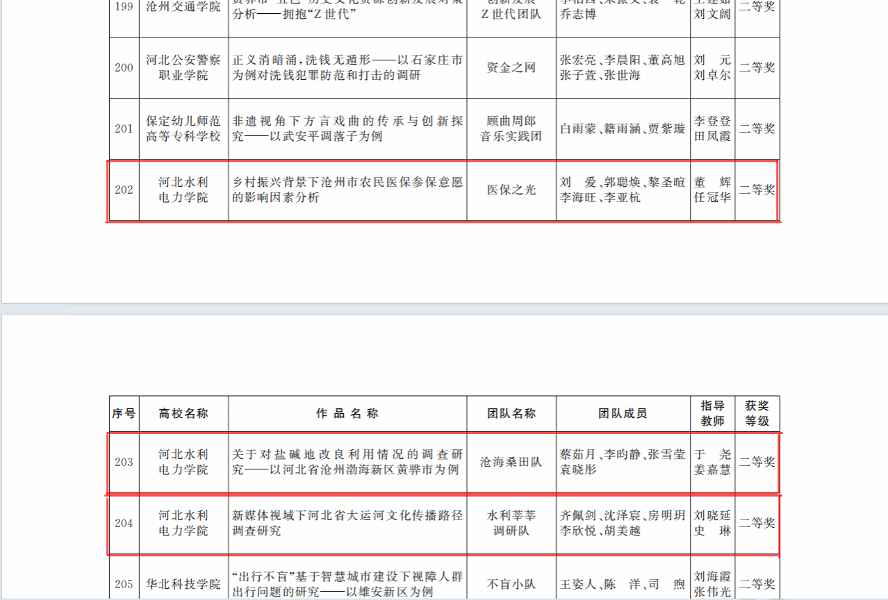 近日,共青团河北省委、河北省社会科学院以及河北省学生联合会公布了关于2023-2024年度河北省大学生“调研河北”社会调查活动情况,我校沧海桑田调研队《关于对盐碱地改良利用情况的调查研究——以河北省沧州渤海新区黄骅市为例》、水利莘莘调研队《新媒体视域下河北省大运河文化传播路径调查研究》、医保之光调研队《乡村振兴背景下沧州市农民医保参保意愿的影响因素分析》分别在活动中荣获二等奖,冀业探索调研队《河北省高校毕业生就业困境的调查研究——以易游中国一站式体育服务平台,为例》荣获三等奖。调研活动自2024年1月开展以来,校团委精心谋划部署,广泛宣传动员,吸引了本校32名教师、100多名同学参加调研,共计报送27个参赛项目,最终4个项目顺利结项并获奖。