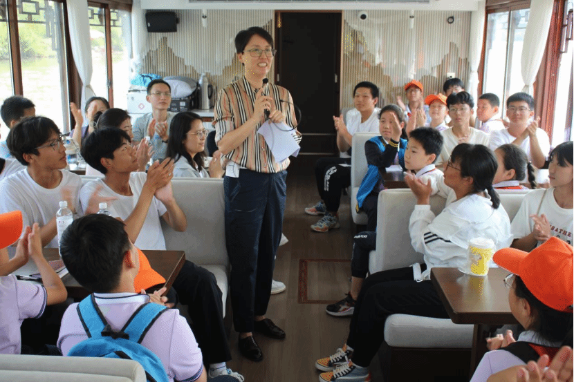 本次活动由百狮园码头乘船,沿“再现运河”航线南下,王凤春老师为大家讲解了中国大运河的形成历史、前世今生和未来展望,以及中国大运河沧州段的起源和水利文化知识。王凤春老师以她深厚的大运河水利文化研究积淀,为大家科普了大运河自春秋至今的发展史。重点讲述了运河文化与沧州历史文化的交融,在水工文化中,王老师用古道美、弯道美、堤坝美、减河美和穿越美来形容运河沧州段;在侠义文化中,用“镖不喊沧”的典故,体现了沧州独一无二的武术文化;在诗歌文化中,用脍炙人口的“蒹葭苍苍,白露为霜”,为我们讲解了沧州与诗经的渊源。最后,王老师鼓励同学们多学习、汲取大运河文化的精神内涵,坚定文化自信,为大运河文化带的建设贡献自己的力量。